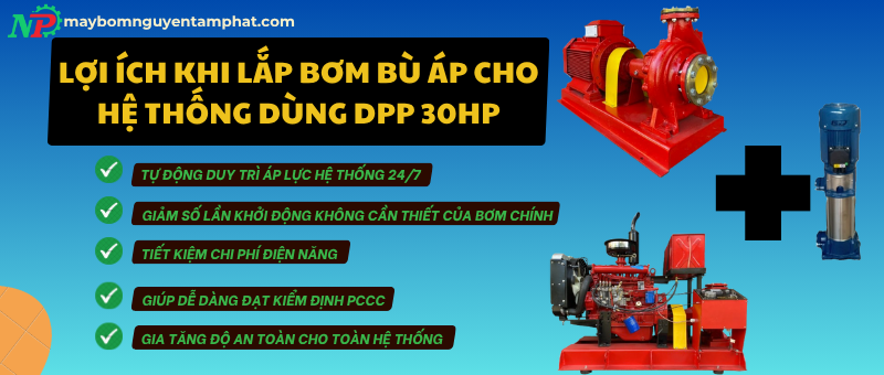 Với công suất 30 mã lực (HP), DPP 30HP có thể tạo ra lưu lượng nước lớn và áp lực mạnh, đáp ứng tốt cho hệ thống ống dài hoặc cao tầng. Tuy nhiên, hệ thống chữa cháy sử dụng dòng bơm này đa phần là hệ thống cố định và hoạt động bán/tự động – nghĩa là cần luôn có áp lực sẵn sàng trong ống, và do đó, bơm bù áp trở thành một phần thiết yếu.