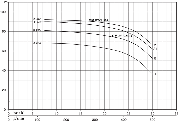 Pentax CM 32-250B có dải cột áp từ 82m - 52,5m tương ứng với dải lưu lượng là 0 - 30m³/h.