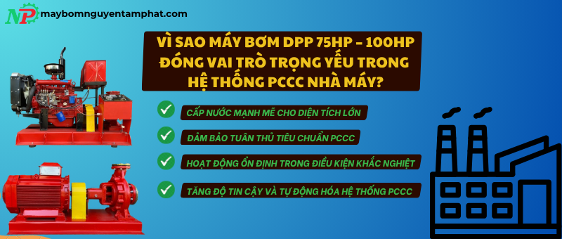 Trong các nhà máy sản xuất quy mô lớn, an toàn phòng cháy chữa cháy (PCCC) không chỉ là yêu cầu bắt buộc theo quy định pháp luật, mà còn là yếu tố sống còn trong việc bảo vệ tài sản, con người và duy trì hoạt động liên tục của dây chuyền sản xuất. Một trong những thiết bị cốt lõi của hệ thống chữa cháy hiện đại chính là máy bơm chữa cháy công suất lớn, và trong đó, DPP 75HP – 100HP là dòng sản phẩm được đánh giá cao về hiệu suất, độ tin cậy và tính linh hoạt trong triển khai thực tế.